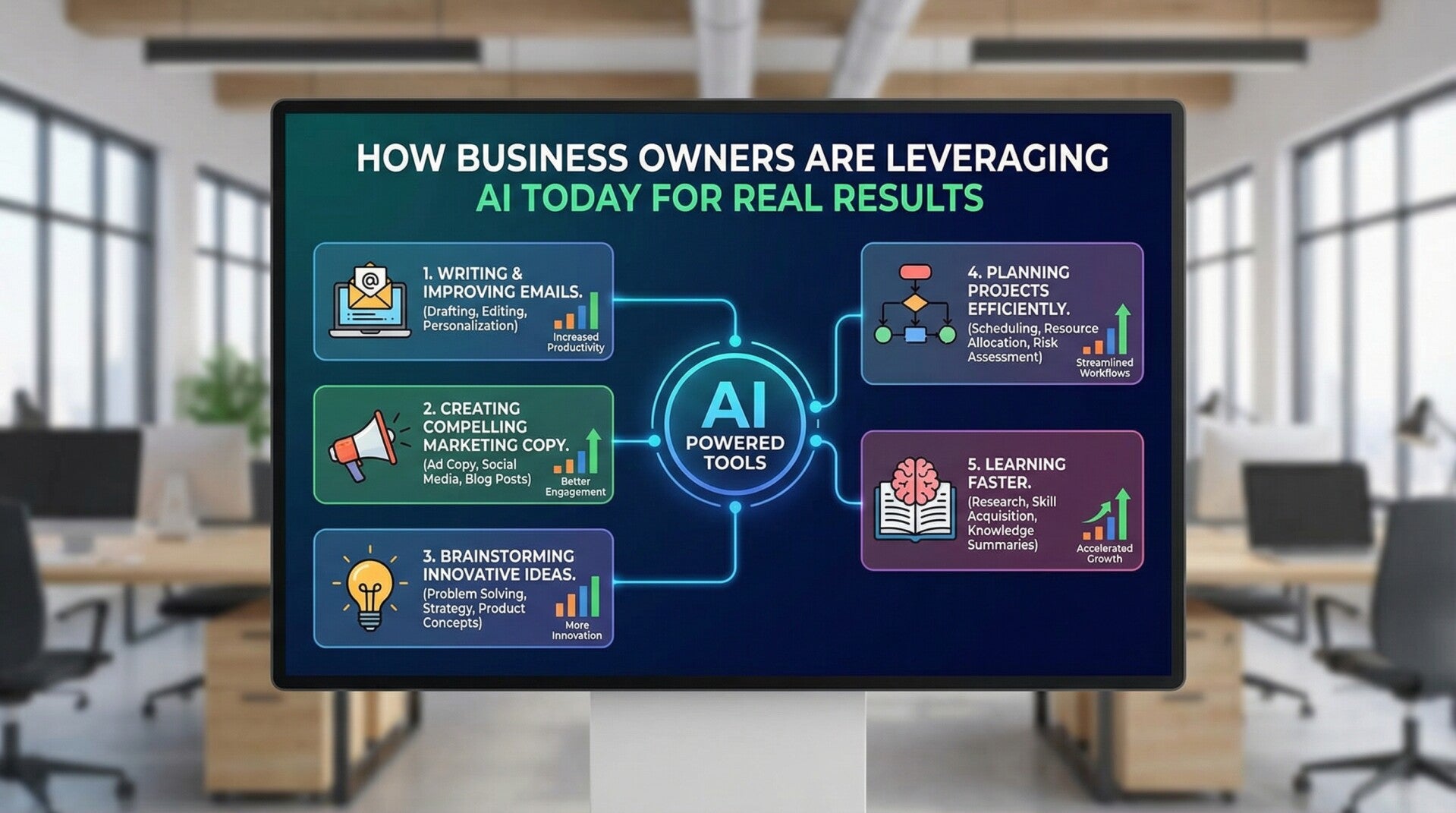 Discover how other business owners are leveraging AI today for real results. Learn practical applications such as writing and improving emails, creating compelling marketing copy, brainstorming innovative ideas, planning projects efficiently, and learning faster.